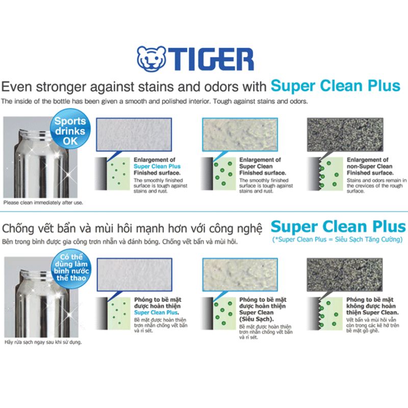 Toàn bộ cấu trúc bình lưỡng tính Tiger MCX-A501 làm từ thép không gỉ tiêu chuẩn SUS304 (18/8) được áp dụng công nghệ “Super Clean Plus” chống gỉ sét, chống ăn mòn, chống dính, chống bám bẩn, khử mùi và dễ dàng vệ sinh ngay cả những thức uống dễ để lại vết bám bẩn và mùi như cà phê / trà mà không gây ra những chất độc hại cho sức khỏe của người sử dụng.