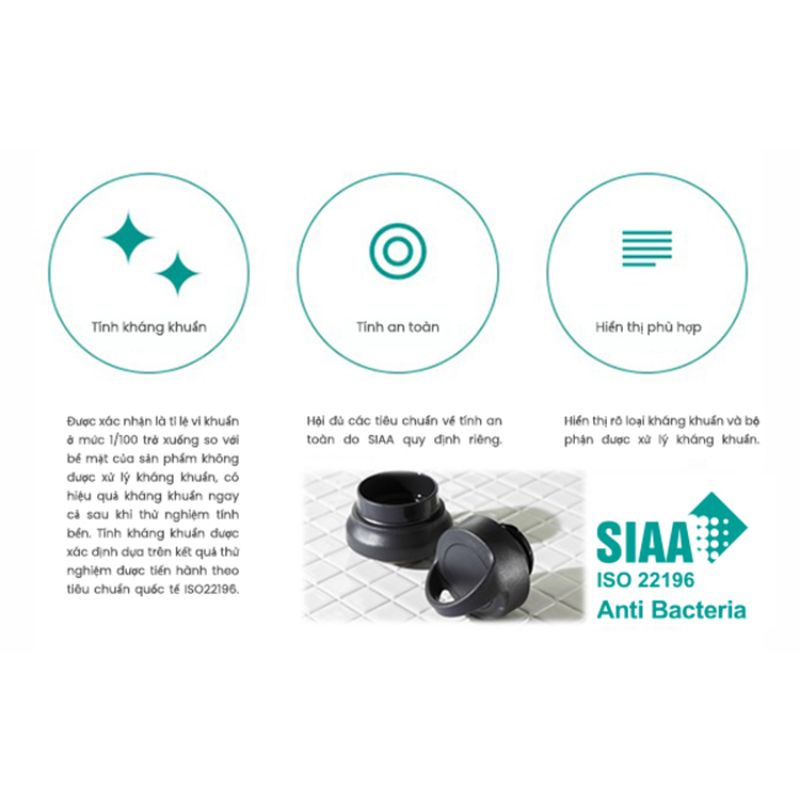 Nắp và miệng bình được xử lý kháng khuẩn đạt chứng nhận SIAA (Hiệp hội công nghệ sản phẩm kháng khuẩn) đem lại sự tự tin và đảm bảo an toàn cho người sử dụng