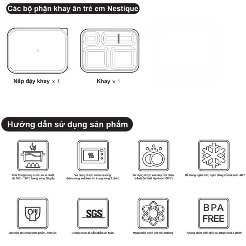 Khay ăn trẻ em cao cấp có nắp hiệu Nestique N-21 được làm bằng vật liệu chịu nhiệt cho phép sử dụng lò vi sóng với mục đích hâm nóng – Hâm nóng trong vòng 2 phút với nước hoặc thức ăn và lưu trữ trong ngăn mát, ngăn đông của tủ lạnh ở nhiệt độ -20°C. Ngoài ra, có thể rửa khay ăn trẻ em trong máy rửa chén ở nhiệt độ dưới 100ºC hoặc có thể thuận tiện làm sạch bằng cách trần trong nước nóng ở nhiệt độ dưới 100°C trong 20 giây (Khi nước đã sôi thì tắt bếp và trần qua). Không sử dụng trong lò nướng, nồi hấp, nồi chiên không khí, vĩ nướng và giấy bạc. Có thể bị đổi màu khi dùng thực phẩm có màu đậm nhưng nếu phơi khay, bát, dĩa dưới nắng sau khi rửa nhẹ thì hầu hết sẽ trở lại màu sắc ban đầu.