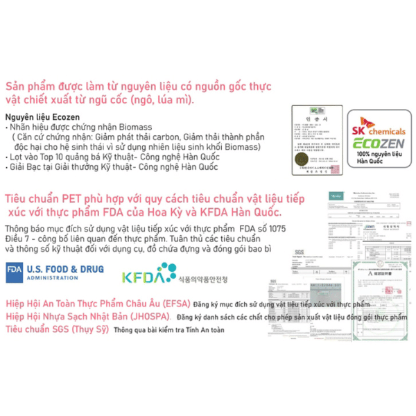 - Chất liệu nhựa : Nhựa Polyalkyl Terephthalat (PET) – BPA Free từ nguyên liệu ECOZEN
