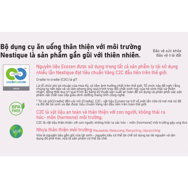 Bộ khay ăn trẻ em cao cấp hiệu Nestique N-21 được làm từ nguyên liệu ECOZEN (có nguồn gốc thực vật chiết xuất từ ngũ cốc như ngô, lúa mì) được chứng nhận BIOMASS và đạt tiêu chuẩn vàng thế giới C2C, một vật liệu thân thiện với môi trường và con người là co-polyester trong suốt làm từ sinh khối với ưu điểm là khả năng chịu nhiệt cao và không thải ra các hormone môi trường gây ung thư.