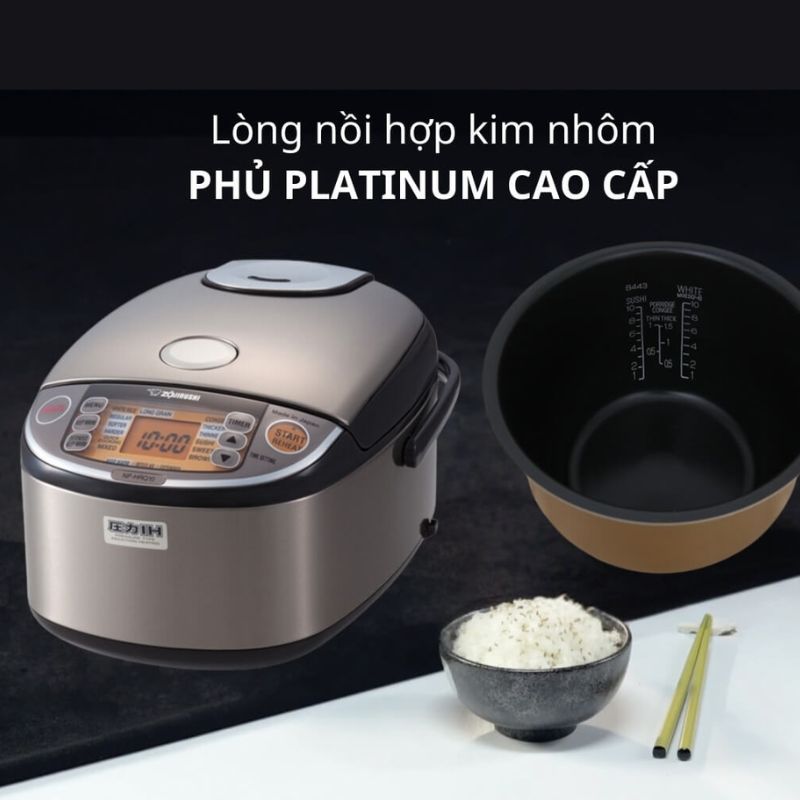 Nồi cơm điện tử cao tần áp suất hiệu Zojirushi lồng nồi “Platinum” chống dính bằng tia hồng ngoại phủ hạt bạch kim tạo kềm dầy 1.7mm với độ bền gấp 5 lần, công nghệ nấu cơm thông minh “AI” tự động điều chỉnh 3 mức áp suất nấu “Pressure IH” từ 1.2 ATM [105ºC] đến 1.0 ATM [100ºC] triệt để tạo độ nhớt và độ đàn hồi của gạo cho hạt cơm dẻo hơn, thơm ngon hơn & tiết kiệm điện cùng với thiết kế mâm nhiệt 3D được tích hợp ở nắp
