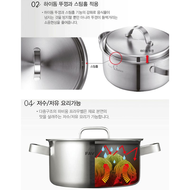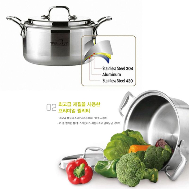 Toàn bộ cấu trúc thép không gỉ cao cấp SUS304 (18/10) 3 lớp nguyên khối thân và đáy dầy 2.5mm, nồi Inox POONGNYUN (PN) Series Withus WTPIH-20C size trung tối đa hóa hiệu suất dẫn và giữ nhiệt làm thức ăn chín đều cực nhanh mà thức ăn không bị cháy khét, tiết kiệm thời gian cũng như chi phí nhiên liệu nấu và giảm sự phá hủy chất dinh dưỡng trong quá trình nấu ăn một cách hiệu quả đặc biệt là các món ăn hầm và luộc.